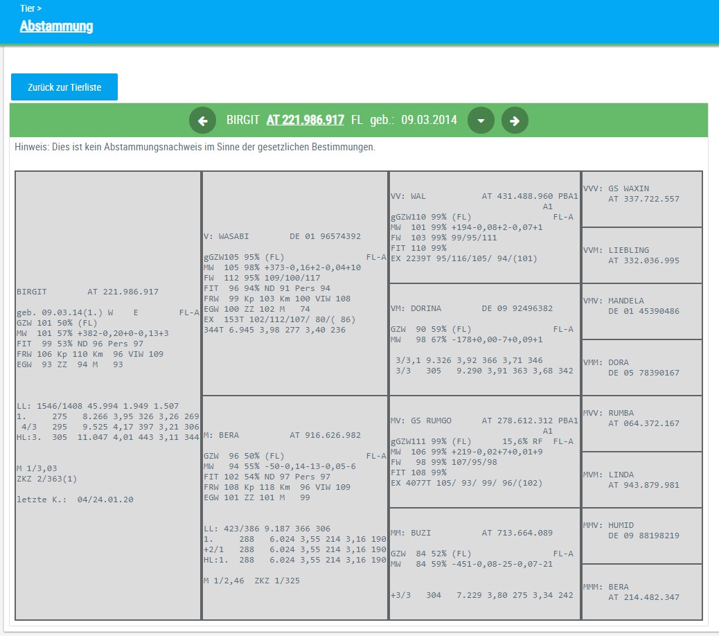 Diese Ansicht zeigt eine 3-Generationen-Abstammungsansicht, inklusive Leistungen und Zuchtwerte, des gewählten Tieres.