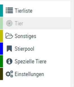 Am linken Rand sehen sie das Navigationsmenü hier können sie die einzelnen Ansichten wählen. Der Menüpunkt Tier wird erst aktiv wenn sie aus einer Ansicht in Tier springen (Klick auf Tiernummer). Bei schmalen Bildschirmen oder auf mobilen Geräten klappt das Navigationsmenü ein - es wird durch Klick auf das Plussymbol (rechts vom LKV Logo) wieder sichtbar.
