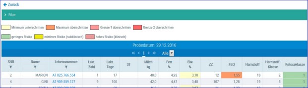 In der Tabelle finden sie alle Kühe bis zum 120. Laktationstag mit den Ergebnissen aus der Milchuntersuchung sowie der Ketoklasse. Sie können die Liste über den Filter nach verschiedenen Merkmalen einschränken.