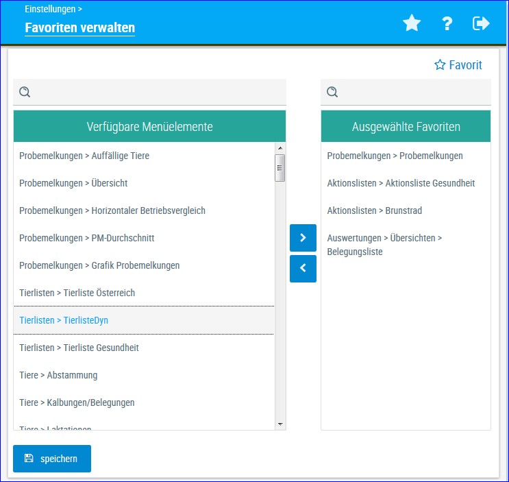 Über diese Schaufelmaske können sie ihre Favoriten verwalten. Markieren sie den gewünschten Menüpunkt und verschieben sie ihn mit den Pfeiltasten nach links oder rechts, bestätigen sie die Änderungen über 'speichern'.